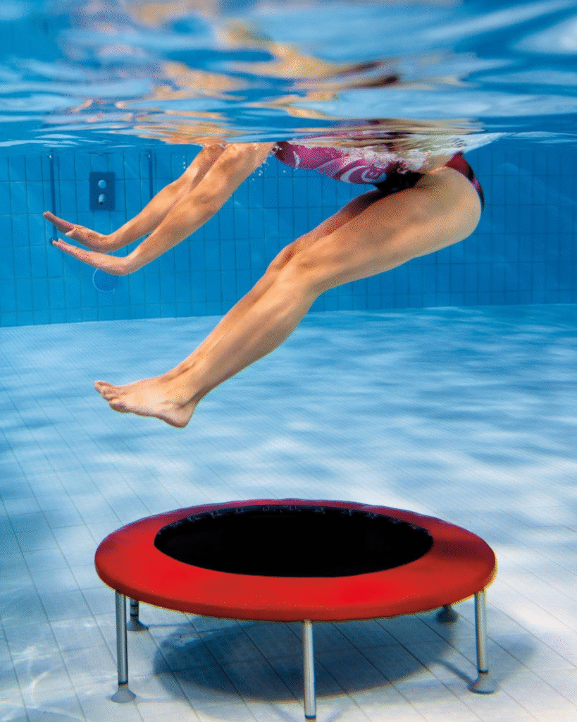 L’Aqua Trampo est un cours complet combinant travail cardiovasculaire, renforcement musculaire et équilibre grâce à l’utilisation d’un trampoline immergé.
